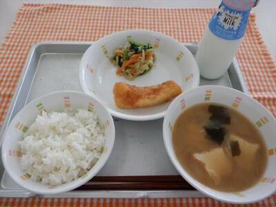 ご飯、いかの唐揚げ、野菜の胡麻しょう油和え、玉ねぎと厚揚げの味噌汁、牛乳