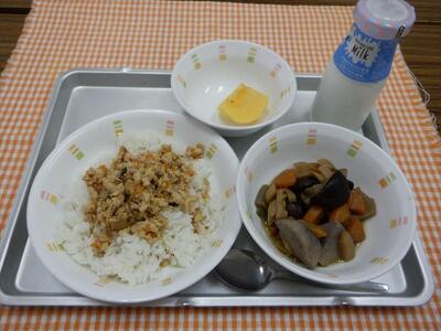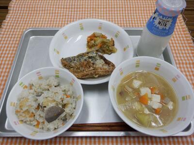 里芋ご飯、鯖の竜田揚げ、白菜のおかか和え、さつま汁、牛乳