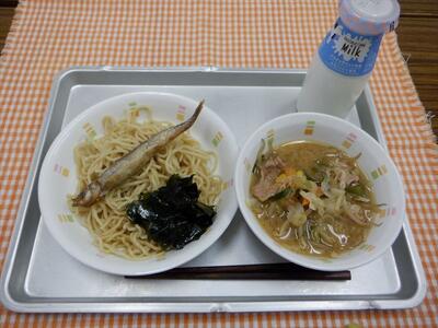 味噌ラーメン、ししゃものカレー揚げ、牛乳
