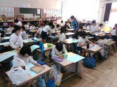 顔のパーツごとに分担して、似顔絵を描いていく6年生たち。