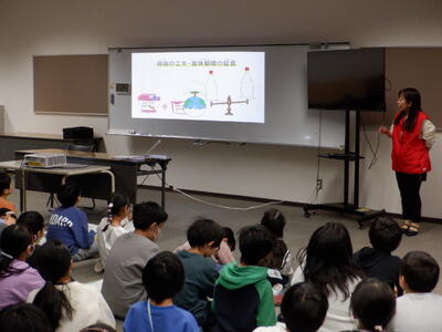ペットボトルを使って、空気鉄砲を作っている科学クラブの子供たちです。
