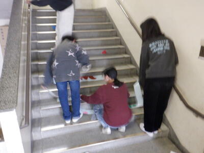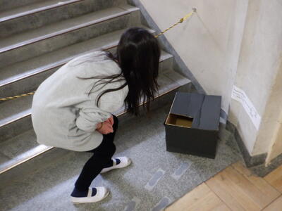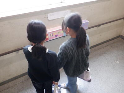 2時間目、4年生が外国語活動の授業のための教室移動で、北校舎の3階の廊下を歩いていると・・・
