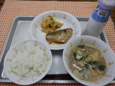 ご飯、鯖の照り焼き、白菜の変わり漬け、豚汁、牛乳