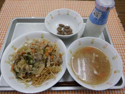 あんかけ焼きそば、せん切り野菜の中華スープ、黒糖アーモンド、牛乳