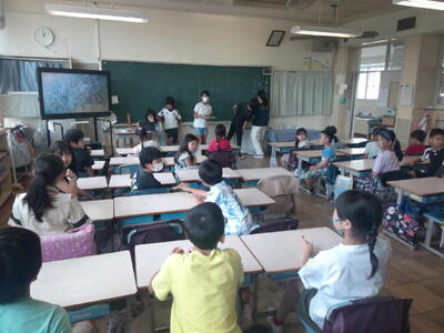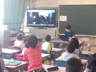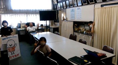 今日の給食の時間に、2人の団員の方にリモートで全校児童に挨拶していただきました。
