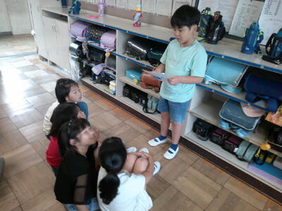 1-3の参観をしようとしたところ、代表児童が年長児たちの前で説明を始めました。