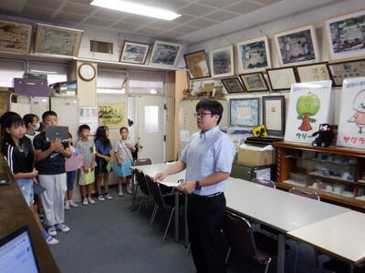 1-4担任「潤徳小では烏骨鶏という鳥が飼われていて、それがモデルになって、サクラモチというキャラクターができたんです。鳥の名前は『大福』といいます。」