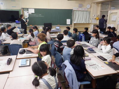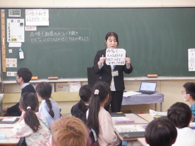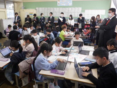 他校を含めた数十人の教員等の参観を受け、緊張する3-4の子供たち。