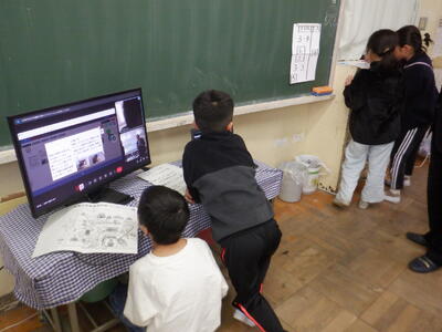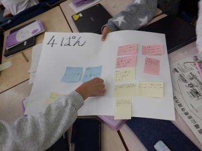 オンライン交流を終えた後は、各班で、八小の3-1の子から教えてもらった「場所」、「新しく分かった点」、「もっと知りたい点」などについて付箋を使ってまとめました。