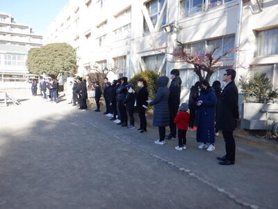 児童集会のために校庭に出てきたら、朝礼台前に黒ずくめの集団がずらりと並んでいるので、ざわつく子供たち。