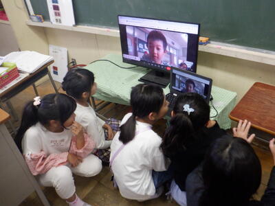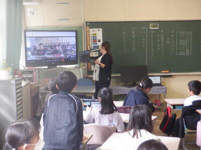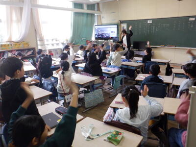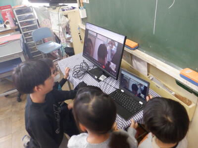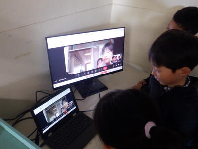 久し振りに八小の3-1の子たちが画面に映って、歓声を上げる本校の3-4の子供たちです。