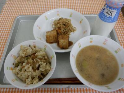 きんぴらご飯、厚揚げのにんにく醤油かけ、切干大根の炒め煮、なめこの味噌汁、牛乳