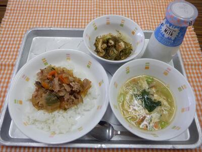 プルコギ丼、白菜と昆布のナムル、チンゲン菜の卵スープ、牛乳