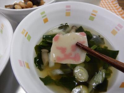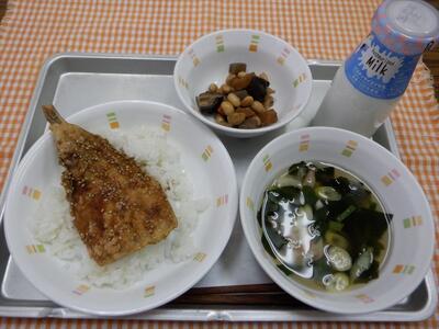 いわしのかば焼き丼、五目豆、くず切りのすまし汁、牛乳