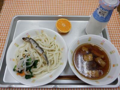 きのこきつねうどん、焼きししゃも、果物(菊花みかん)、牛乳