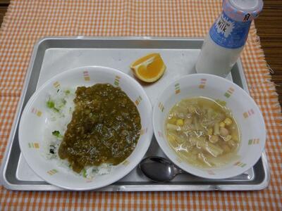 小松菜のドライカレーライス、パスタと野菜のスープ、果物(オレンジ)、牛乳