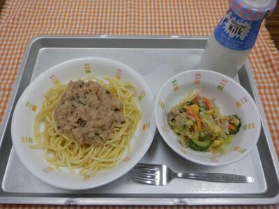 大根おろしとツナのパスタ、スタミナサラダ、牛乳