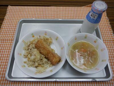 キムタクご飯、いかの唐揚げ、大根スープ、牛乳
