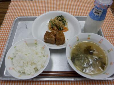ご飯、厚揚げのごまだれかけ、人参と切干のナムル、わかめとねぎのスープ、、牛乳