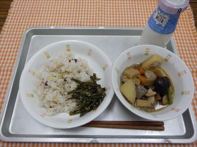さつま芋と小豆のおこわ、鶏肉と根菜の煮物、茎わかめのピリ辛炒め、牛乳