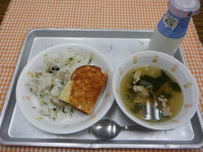 じゃこ入り青菜ガーリックライス、ツナとキャベツのオムレツ、レンズ豆のスープ、牛乳