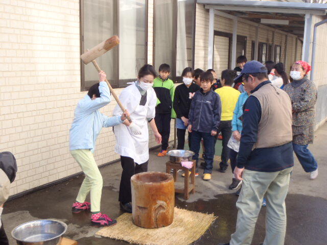 もちつきは、水辺の楽校スタッフ、学校評議員、PTAの皆様をはじめ、地域の皆様にご協力を頂き、実現したものです。