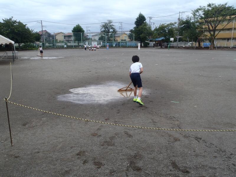 昨夜からの雨で、校庭には水溜まりがたくさんできていました。