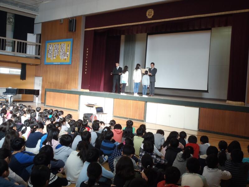 約1年間の実践の成果を全校児童の前で発表しました。それぞれ発表後、大きな