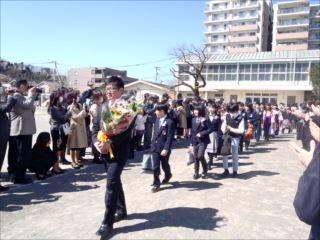 青空、桜満開の下、保護者や教職員などに見送られながら、130名の卒業生が、それぞれの進学中学校に向かって飛び立ちました。あなた方の未来に、幸多かれとお祈りします。