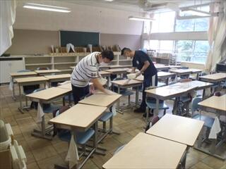 AグループとBグループの間、Bグループ終了後に教職員で消毒作業を行っています。机の上、教室やトイレのノブなどを調理員の方々にも協力してもらいながら行っています。