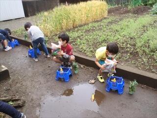 中学年の先生たちは、勉強で使用するためにプールでヤゴを採取していました。