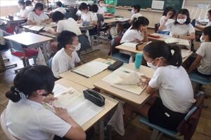 6年生 6年生は家庭科で、Tシャツエコバックを作成しています。もうサイズが小さくなったTシャツや大人のTシャツなど、大きさもいろいろなエコバックができそうです。(2組)