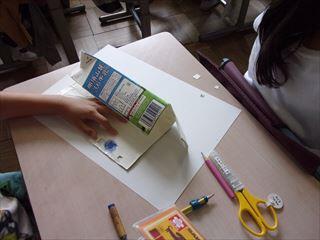 牛乳の紙パックに小さな窓を作り窓のふちをなぞって花びらの輪郭を作ります。