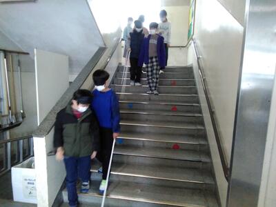 実際に2人1組になって、1人が案内役、もう1人がアイマスクをして白杖を持ち、教室から校庭まで出る体験をします。