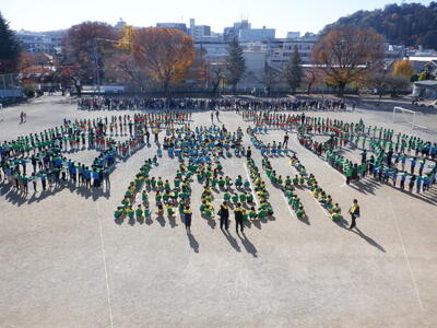 開校150周年記念式典後には、全校児童はもちろんのこと、ご来賓、保護者、地域の皆様が参加可能な航空記念写真を撮影いたしました。
