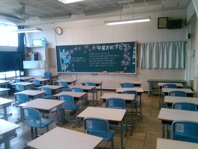 卒業式後、6年生の教室を見回ると、担任による温かいメッセージが教室の黒板に残されていました。