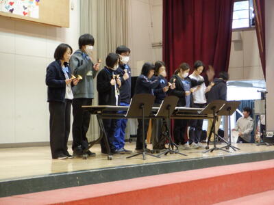 歌、リコーダー、鍵盤ハーモニカ、旗のコラボレーションがバッチリ決まっていました。