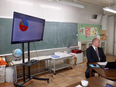 今日の給食の時間に、2人の団員の方にリモートで全校児童に挨拶していただきました。