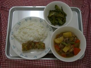 ☆今日の給食は、6年生が家庭科の学習で考えた献立です。オータムカレーには、秋が旬のさつま芋やきのこ、秋に収穫期を迎える大豆が入っています。