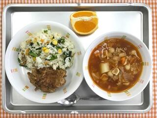 なのはなピラフ 鶏肉のからあげ ミネストローネ 清見オレンジ 牛乳