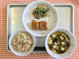 鮭の炊き込みご飯 厚揚げのにんにくみそかけ アーモンド和え 味噌汁 牛乳