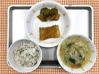ごましおご飯 いかのレモンしょうゆ コチュジャン和え ビーフンスープ 牛乳