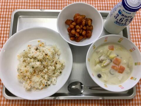 ごはん 昆布の佃煮 いかのかりんと揚げ ごま和え 味噌けんちん汁 牛乳