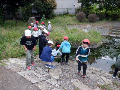 池のところで、棒を使って釣りのようなことをしている子たちもいます。
