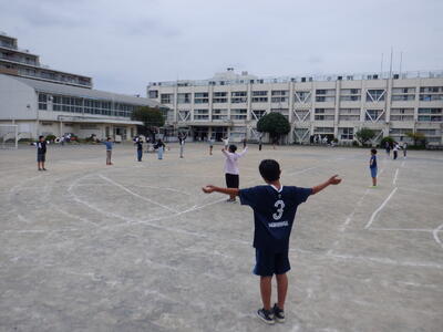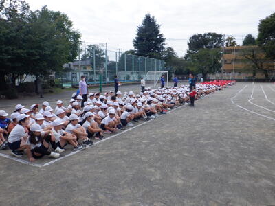 校庭で、実際に演示をする場所に立って、準備運動・整理運動を放送に合わせて確認していました。