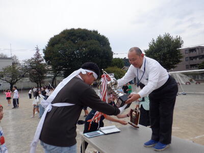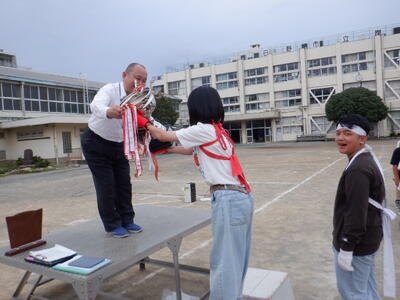 ちょうど、校長も校庭で取材を行っていたので、閉会式で優勝杯授与をする練習に付き合いました。