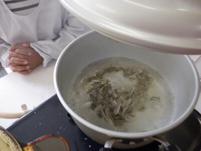みそ汁の方は、特別講義で学んだとおり、煮干しの頭、はらわたをとり、だしをとっていきます。