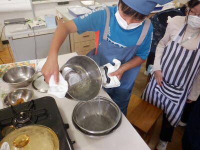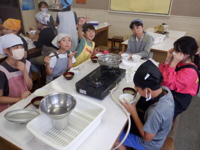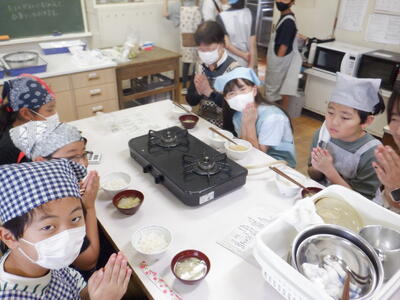 家庭科でごはんとみそ汁の調理実習を行う5年生。