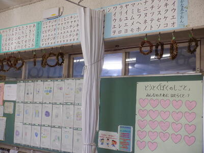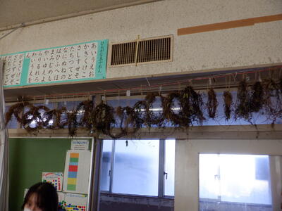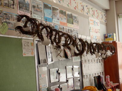 1年生が育てていたアサガオも、枯れてきました。そこで、1年生は、そのつるを使ってリースづくりをしています。今、つるを輪に巻くところまで終わり、教室に飾っています。