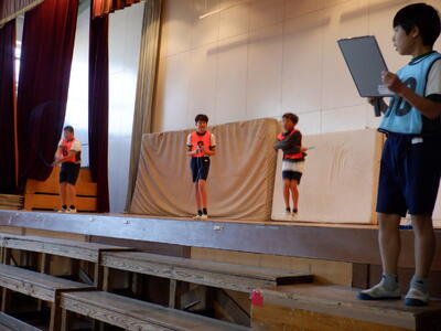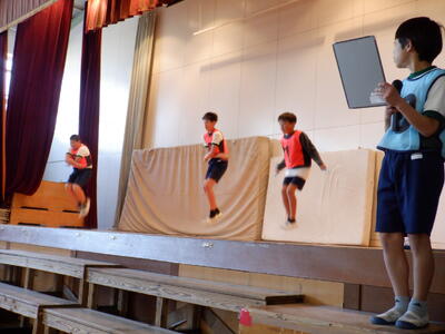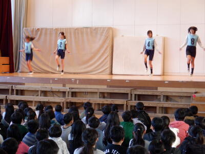 今朝の体育朝会では、短縄週間で取り組む技の紹介がありました。